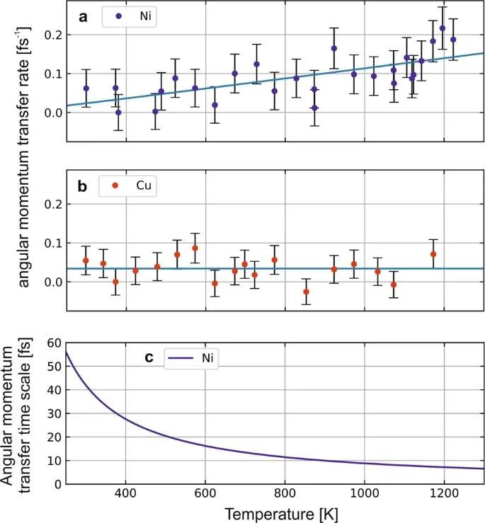 XES光譜獲得的(a) 鎳(b) 銅 角動(dòng)量轉(zhuǎn)移率。(c)是從(a)中的擬合速率推導(dǎo)出的動(dòng)量轉(zhuǎn)移壽命。
