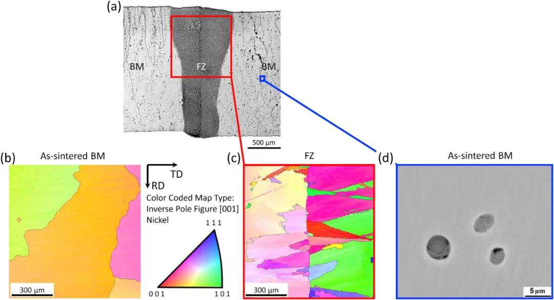 ▲圖6 (a) 激光焊接接頭及其EBSD分析得到的IPF圖, (b)沉積態和(c) 焊接接頭的熔化區, (d)沉積態的基材中的MnS夾雜物的 SEM-BSE 圖像