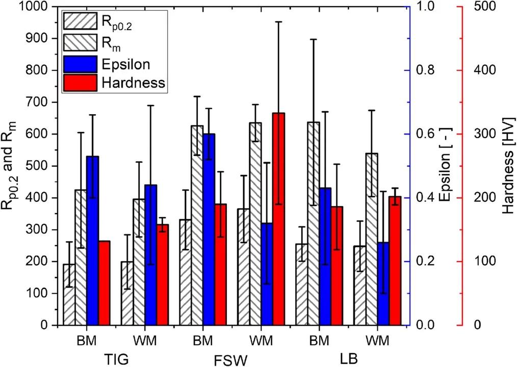 圖4中總結了不同焊接工藝對CoCrFeMnNiHEA力學性能的影響。對不同焊接工藝的屈服強度(Rp0.2)、抗拉強度(RM)、斷裂伸長率(ε)和WM的平均值進行比較:與焊接條件相比,TIG和LBW(FSW稍后討論)、RM和ε降低,同時硬度增加。這與機械性能的下降相對應,這主要反映在延性的降低,也可能是WM的韌性,即對阻力的降低。與BM相比,裂紋增長。在這方面,發生的焊接殘余應力與使用的焊接熱輸入是重要的,應該在未來的研究中進行研究。Wu等人認為,與焊接接頭相比,焊接接頭的力學性能下降對WM中粒徑和元素分離產生影響。