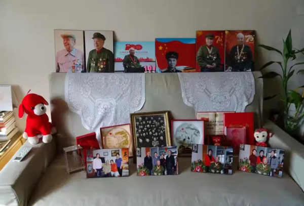 圖3、劉老將軍家的客廳沙發上擺放著老將軍胸前掛滿軍功章的照片,當年與毛主席、朱總司令、周總理的合影,由中共中央、國務院、中央軍委頒發的“慶祝中華人民共和國成立70周年紀念章”,慶祝建黨百年榮獲的“光榮在黨50年”紀念章和多個榮譽證書,以及學會贈送的水晶雕像和拉米娜相框