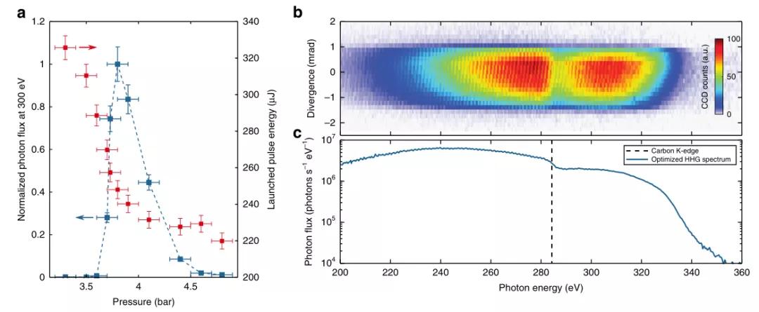 經(jīng)實(shí)驗(yàn),空芯光纖輸入端氣壓為1 bar,輸出端氣壓3.345 bar時(shí)可以獲得較好的結(jié)果:當(dāng)輸入脈沖能量為265 μJ時(shí),脈沖寬度從100 fs減小到輸出端的20 fs,隨著峰值功率的升高,在脈沖的后段出現(xiàn)電離現(xiàn)象。實(shí)驗(yàn)中通過(guò)調(diào)整氣壓和輸入脈沖的方式產(chǎn)生了300 eV的高通量脈沖。圖2(a)展示了最佳輸入脈沖能量和對(duì)應(yīng)的最大X射線光通量隨高壓氣室氣壓的變化,縱向誤差來(lái)自240次連續(xù)測(cè)量的標(biāo)準(zhǔn)差,橫向誤差恒定為氣壓讀數(shù)的不確定度0.1 bar。從圖中可以看到信號(hào)光對(duì)氣壓敏感,以3.8 bar為中心,10%的氣壓變化將導(dǎo)致光通量變?yōu)樵瓉?lái)的1?e^2 ,但模擬可知泵浦光對(duì)氣壓不敏感,10%的氣壓變化下脈沖積累的非線性和輸出端峰值功率變化不大,由此證明氣壓梯度主要影響了相位匹配。圖2(b)為最優(yōu)情況下測(cè)得的光譜和發(fā)散情況,發(fā)散角約2 mrad,截止能量330 eV,中心對(duì)應(yīng)碳原子吸收帶,可能來(lái)自光譜儀光柵上沉積的有機(jī)污染。圖3(c)為去除碳原子吸收后的光譜,300 eV處光通量超過(guò)10^6 s^(-1) (eV)^(-1)。