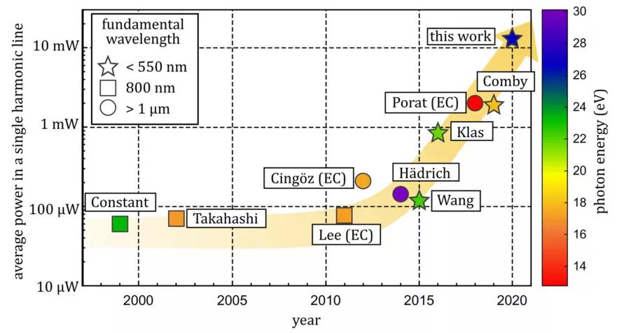 圖3為1999年至今產(chǎn)生12 eV到30 eV(100 nm到40 nm),10 μW以上極紫外光的實(shí)驗(yàn)結(jié)果,縱軸為平均功率,顏色對(duì)應(yīng)光子能量,圓形代表泵浦源為中心波長(zhǎng)1 μm的摻鐿激光器,方形代表鈦寶石激光器,星型代表對(duì)兩種激光器進(jìn)行二倍頻或三倍頻,EC代表使用了增強(qiáng)腔(enhancement cavity)。驅(qū)動(dòng)脈沖的脈寬越小、平均功率越高、波長(zhǎng)越短,產(chǎn)生的極紫外光通量越大、效率越高、截止能量越高。本文中使用平均功率51 W、中心波長(zhǎng)為515 nm、寬度為18.6 fs的驅(qū)動(dòng)脈沖產(chǎn)生了平均功率12.9 mW、光子能量為26.5 eV的脈沖,效率為2.5×10^(-4),與過(guò)去的記錄相比,功率提升了一個(gè)數(shù)量級(jí)。