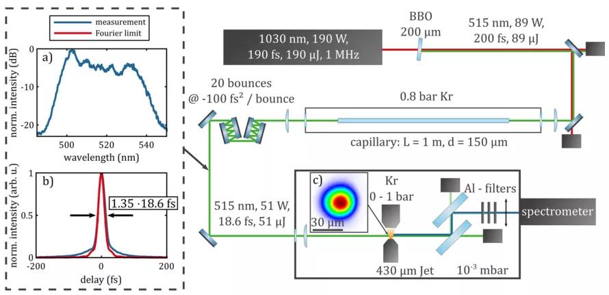 第二篇文章也是利用空芯光纖產(chǎn)生高次諧波,但是產(chǎn)生的是波長(zhǎng)更長(zhǎng)的極紫外光[2]。與上一篇文章不同,這里的空芯光纖只起到展寬光譜的作用,脈沖壓縮在光纖外進(jìn)行。