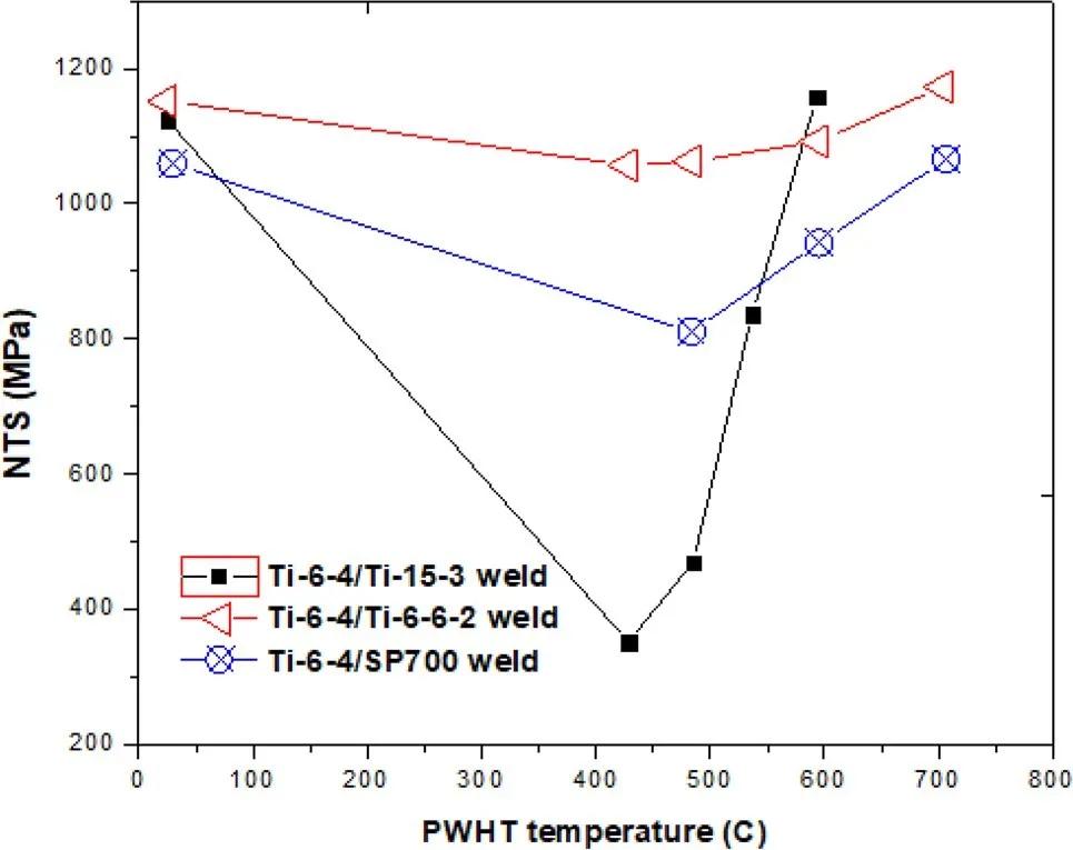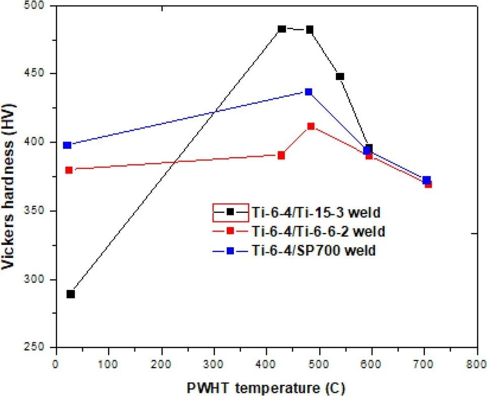 此外,可以在圖7中觀察到,在Ti-6-4/Ti-15-3的DTW中,與Ti-6-4/Ti-6-2(從室溫下的380 HV到483°C下的412 HV)或Ti-6-4/SP700相比,高達427°C的焊后熱處理導致顯微硬度的最大增加(從室溫下的289 HV到427°C下的近483HV)(從室溫下的398 HV到478°C下的約437 HV)這是因為如圖9所示,Ti-15-3母材中的MoEQ約為13.8。從圖7和圖10中可以進一步看出,顯微硬度和NTS值對PWHT的敏感性隨著DTWs中任何合金MoEQ的降低而降低,就像Ti-6-6-4/Ti-6-4焊縫的情況一樣。