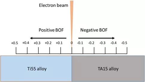 在這種方法中,焊接過程中的能源束稍微偏離焊縫中心線。Ti55/TA15電子束焊接中光束偏移位置示意圖如圖11所示。這種方法只能在一定程度上用于束焊工藝,如LBW、EBW和攪拌摩擦焊。偏移梁的目的是改變每個BM對焊縫區成分的貢獻,以改善焊縫性能。該技術最初用于鈦合金與其他金屬(如鋁合金)的焊接,其中光束偏移的目的是減少焊接接頭中形成脆性金屬間相的程度。在這種方法中,向特定基底材料偏移光束會增加其對FZ的貢獻。