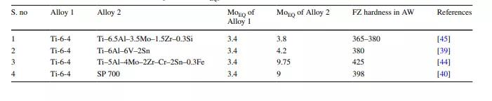 在所有上述研究中,可以觀察到,不同鈦合金之間DTW接頭的合成性能取決于許多因素,如化學成分、物理和機械性能等。例如,自生焊縫的抗拉強度可能高于收到的鈦合金。類似地,在表2所示的其他趨勢中,焊接接頭強度與低強度合金相當,甚至可以比高強度合金更高。然而,這種趨勢不能概括,因為基于合金化學,DTW接頭的強度可能低于兩種基礎合金。第4.2節討論了影響這些趨勢的潛在因素。
