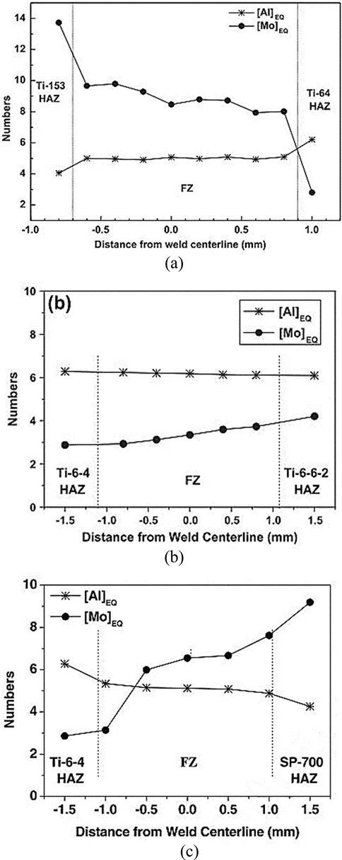 圖9 a Ti-6-4/Ti-15–3、b Ti-6-4/Ti-6-6-2和cTi-6-4/SP700三種不同類型焊縫的AlEQ和MoEQ變化規律