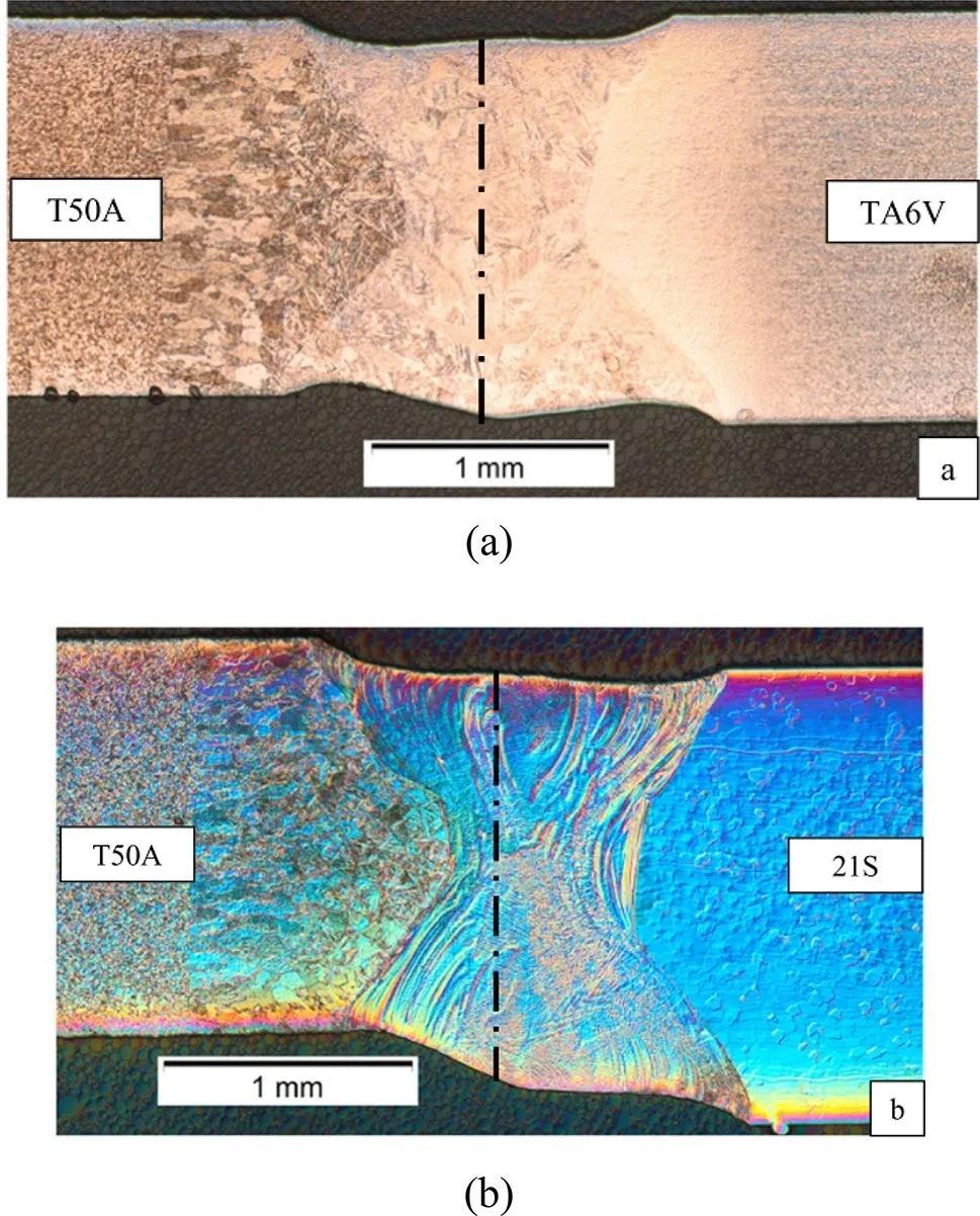 在DTWs中,朝向特定基底金屬的熱影響區寬度隨著基底合金導熱性的增加而增加。兩種基材的熱膨脹系數之間的顯著差異也會顯著扭曲熔池形狀,使其不對稱。此外,光束偏移也會顯著影響HAZ區域,相當大的偏移可能會導致焊縫金屬接合處未對準,如圖14所示,其中有一個朝向DTW 21S側的顯著光束偏移(圖14b),而在圖14a中,T50/T-6-4DTW是在沒有光束偏移的情況下獲得的。