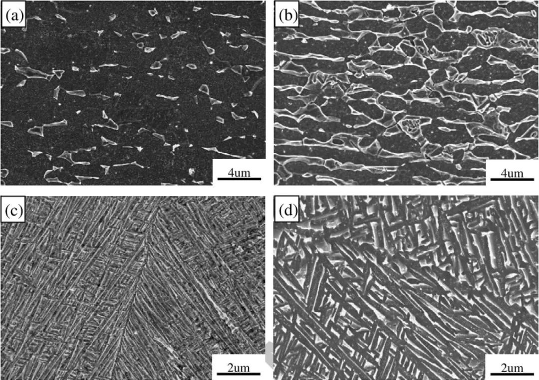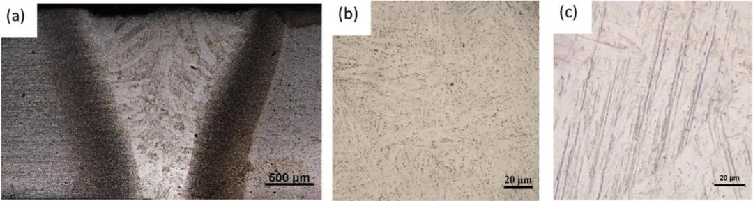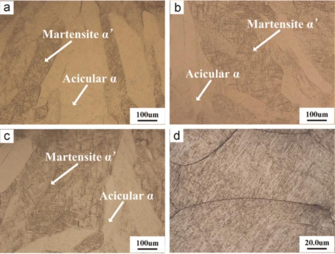 然而,EBW中沒有保護氣體會降低冷卻效果,FZ中很難實現完全的馬氏體相變,尤其是鈦合金,因為它們的導熱性較低,耐熱性增強。這可以在圖5中觀察到,其中TA15/Ti55 DTW EB焊接件的FZ中存在針狀α和馬氏體α'。在LBW中,最佳焊接參數的組合可能導致完全的馬氏體相變,并且可以在圖6c中Ti-6-4/SP-700 DTW的CO2激光焊接FZ中觀察到。