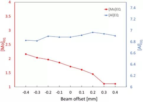 例如,在圖12中,可以觀察到FZ的MoEQ和AlEQ是Ti55/TA15接頭焊接中電子束偏移的強大函數。這種依賴性是由于梁相對于焊縫中心線的位置變化對焊縫區合金元素夾雜物的影響。焊接中光束的實際偏移通常并不直接,需要一個反饋回路(LBW情況下為光電探測器)來檢測光束的位置。
