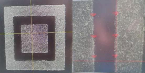繼續降低脈寬到1ns的時候,在合適的參數下,可以穩定的進行雕刻,效果如下。在顯微鏡下觀測,其崩邊小于50μm,無明顯裂紋。
