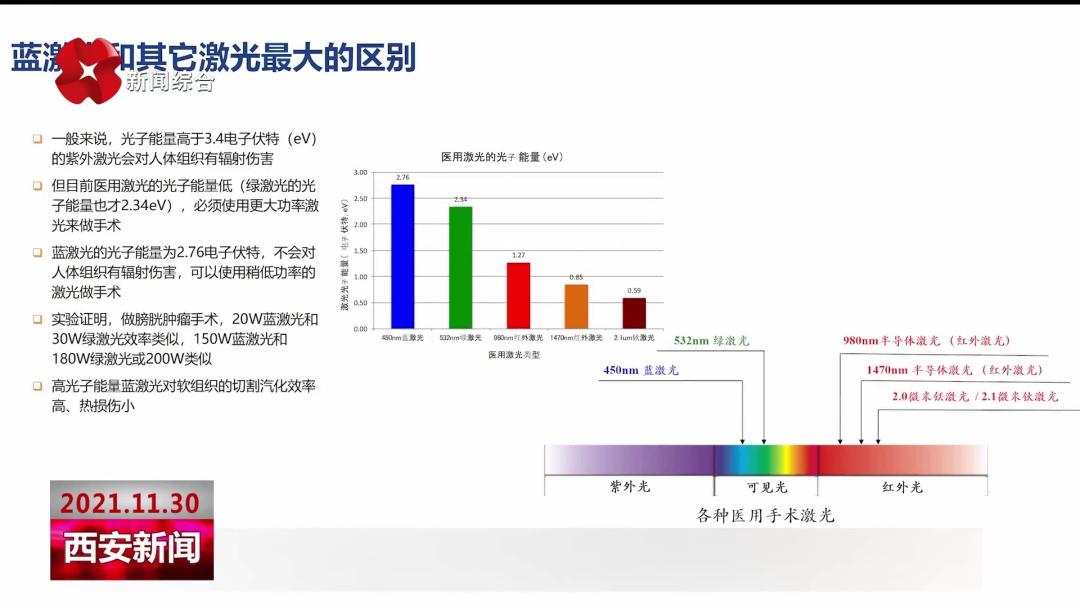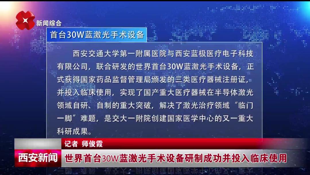 研制成功并投入臨床使用重大突破近日,由西安交通大學第一附屬醫院和西安藍極醫療電子科技有限公司聯合研發的世界首臺輸出功率30W藍激光手術設備正式獲得國家藥品監督管理局頒發的三類醫療器械注冊證并投入臨床使用,實現了國產重大醫療器械在半導體激光領域自研、自制的重大突破。在臨床應用上,藍激光相比于傳統的紅激光、綠激光等,具有汽化效果更快、止血效果更好、對組織熱損傷更小等優點,而且設備的體積和噪音更小,更加易于推廣。西安交大一附院泌尿外科賀大林教授團隊基于醫工結合的思路,與西安藍極醫療首席科學家穆力越博士合作,歷時五年研發出世界首臺30W藍激光手術設備,該設備切除效率高、噪聲小、可視性好,無閉孔神經反射、術中無任何出血,無碳化組織,有利于傷口快速愈合,解決了激光治療領域“臨門一腳”的難題。截至目前,西安交大一附院已利用該設備成功實施兩例手術。下一步,研發團隊還將研發200W藍激光設備,并將藍激光設備逐步推廣應用到消化科、婦科、耳鼻喉科、呼吸科和口腔科等領域的疾病治療,同時,推進藍激光技術培訓和相關領域人才培養,將設備推廣應用到基層醫療機構。“長安號”微信公眾號
