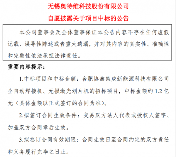 12月7日,無錫奧特維科技股份有限公司發(fā)布項目中標(biāo)公告,中標(biāo)合肥協(xié)鑫集成新能源科技有限公司全自動焊接機(jī)、 無損激光劃片機(jī)采購項目,中標(biāo)金額約 1.2 億元。因設(shè)備平均...