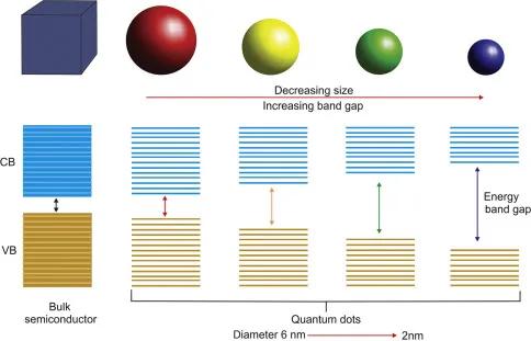 量子點(diǎn)的電子特性介于塊狀半導(dǎo)體和孤立分子。光電特性是由它們的大小和形狀決定的,并隨著這些變量的變化而變化。例如,當(dāng)量子點(diǎn)被一個(gè)能量光子hν(其中,ν是入射光子的頻率)激發(fā)時(shí),那些相對(duì)較大的尺寸,在大約5-6納米,發(fā)射橙色或紅色波長(zhǎng)的能量。較小的量子點(diǎn)發(fā)射出藍(lán)色或綠色范圍內(nèi)較短的波長(zhǎng)。因此,可以通過(guò)改變網(wǎng)點(diǎn)大小和形狀來(lái)調(diào)整這些屬性以獲得所需的輸出。圖3.3顯示了量子點(diǎn)的帶隙隨尺寸變化的變化情況。量子點(diǎn)可以由單元素材料(如硅或鍺)或化合物半導(dǎo)體(如CdSe、PbSe、CdTe和PbS)制成。量子點(diǎn)有時(shí)也被稱(chēng)為“人工原子”,因?yàn)檫@些材料表現(xiàn)出在原子和分子中可見(jiàn)的離散電子態(tài)。