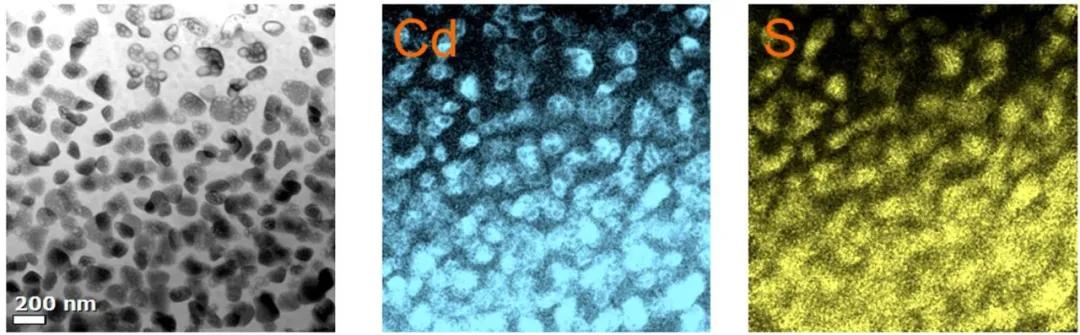 TEM圖像(圖2d)顯示初始玻璃中沒(méi)有納米晶體,而在激光照射的微區(qū)中檢測(cè)到不同尺寸的納米晶體(圖2(e-h))。在激光寫(xiě)入疇中心發(fā)現(xiàn)了最大尺寸達(dá)340nm的分散納米晶體。EELS圖譜明顯顯示沉淀的納米晶體由Cd和S組成(圖3)。