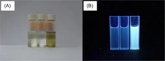250°C環(huán)境光(A)和紫外燈(B)下的光致發(fā)光比較。從左到右依次為椰殼CD、紅麻CD、efb CD。
