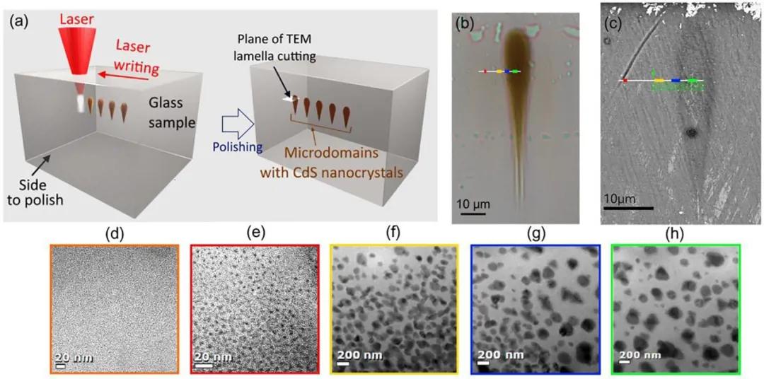 隨著納米晶尺寸的減小,納米晶的濃度顯著增加。這證實(shí)了激光驅(qū)動(dòng)CdS從疇中心向外圍的熱擴(kuò)散。平均大小為3.4±0.4 nm的CdS量子點(diǎn)位于離疇邊緣相當(dāng)遠(yuǎn)的位置(圖2(b,c,e))。觀測(cè)到的偏差可能與拋光精度不足有關(guān)。另一個(gè)可能的原因是,考慮到聚焦離子束的熱效應(yīng),不能排除在片層制備過(guò)程中CdS納米晶體的沉淀和生長(zhǎng)。由于在未輻照的玻璃中沒(méi)有發(fā)現(xiàn)納米晶,可以得出結(jié)論,激光書(shū)寫(xiě)導(dǎo)致玻璃成分在疇附近通過(guò)熱擴(kuò)散顯著改變。這可能會(huì)促進(jìn)納米晶體的形成。