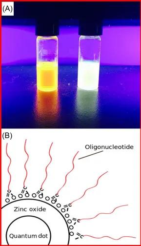 量子點(diǎn)。(A)在量子點(diǎn)溶液上激發(fā)紫外光時(shí),發(fā)出不同顏色的光。(B)氧化鋅、羧基和寡核苷酸覆蓋在量子點(diǎn)表面,以促進(jìn)DNA結(jié)合。改編自Wikipedia, 2017:量子點(diǎn)的DNA功能化[Online]。(2018.1.5)https://en.wikipedia.org/wiki/DNA-functionalized_quantum_dots.