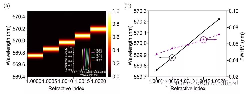 通過改變器件所處的環境折射率,研究人員進一步對器件的氣敏傳感特性進行了研究。結果表明器件對環境的改變有著靈敏的響應,當環境折射率改變量僅為0.0005時,器件的響應光譜峰位就有著很明顯的移動(圖4a),達到現實普通光譜儀的測量范圍。此外,光譜峰位的移動量和折射率改變量呈線性關系(圖4b),表明該有源器件對氣體環境有著良好的檢測功能。由于BIC激光具有非常窄的線寬,計算得到器件傳感靈敏度為221 nm/RIU,品質因子高達4420 RIU-1。該指標高出先前報道的無源傳感器品質因子一個量級,充分說明該準BIC激光器件在危險氣體檢測方面具有很強的實用價值。