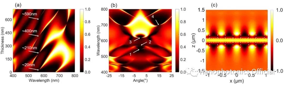 研究人員首先對未加入有機增益的耗散結構進行了系統研究。在光柵寬度T = 230 nm,占空比F = 0.5,周期Λ = 530 nm的條件下,通過改變光柵厚度我們可以看到反射譜在特定的位置出現了不連續的現象(圖2a)。通過角譜分析,我們發現該結構中存在多種BIC:對稱保護型BIC,偶然型BIC以及法布里-珀羅型BIC。圖2a中“斷點”對應圖2b中Γ點處模式2。此外,結合(x, z)平面電場分布,可以發現大部分能量束縛在由光柵組成的諧振腔內,進而可以判斷模式2為FP-BIC。對于其機理可以理解為耦合到單個輻射通道的模式在沒有其他損耗的情況下,由于直接傳輸和共振輻射會相互相干相消,進而在諧振頻率附近產生反射。兩個同樣的結構就可以組成一對高反射鏡,進而形成一個法布里-珀羅型微腔。通過調整高反鏡之間的距離可以使反射波往返的相移為2π的整數倍,這樣就可以促使法布里-珀羅型BIC 模式的形成。
