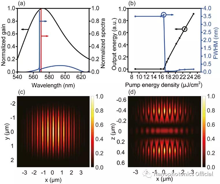 在模式2理想BIC的基礎上,通過改變SiO2厚度獲得準BIC模式。并通過摻入有機增益補償結構內在損耗,實現了準BIC模式的激發,形成了BIC激光。圖3為激光激射表征結果。輸出能量在閾值之上突然和泵浦能量呈線性增長以及光譜線寬的急劇變窄都體現了激光的激射行為。
