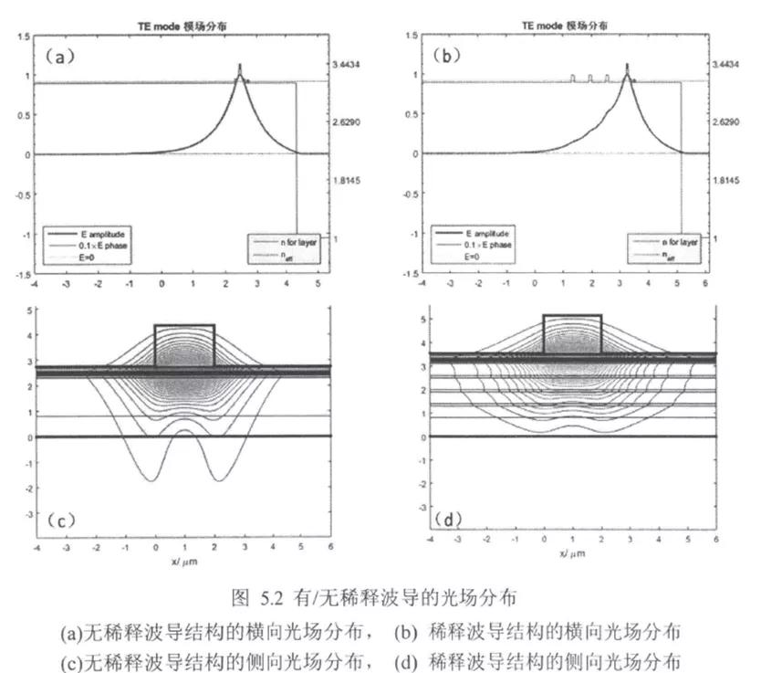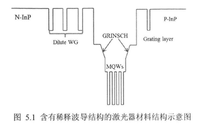 非對(duì)稱(chēng)包層就是將n層和p層的折射率設(shè)置的不一樣,將光場(chǎng)分布偏移到n層,損耗較小,下圖的稀釋波導(dǎo)也起到非對(duì)稱(chēng)包層的作用,可以看到光場(chǎng)分布有一定的變化,稀釋波導(dǎo)采用InP和InGaAs交替生長(zhǎng),一是散熱效果比較好,二是可以?xún)?yōu)化折射率降低限制因子減小損耗。