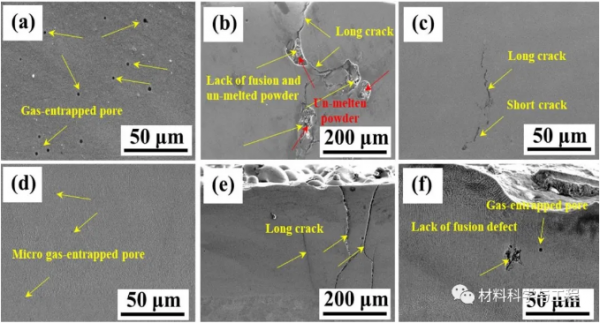 圖1 (a-c) CLMD和(d-f) EHLMD涂層典型冶金缺陷:氣孔、熔融缺陷和涂層中的裂紋。研究結果表明,EHLMD和CLMD都產生了與大部分激光增材制造技術類似的缺陷,主要包括三種類型:裂紋、氣孔和熔融缺陷。保護氣或者是粉末在熔化過程中產生的氣體在熔池中滯留,導致氣孔的形成,但是EHLMD的氣孔的尺寸和數量相對更少。此外,部分粉末顆粒沒有達到熔點而留在熔池中,這是形成熔融缺陷的主要因素。由于EHLMD過程中采用較高的搭接率,單道熔池之間可以互相滲透,確保充分的冶金結合,促使EHLMD涂層中這些缺陷的面積和尺寸明顯小于CLMD涂層。兩種方法制備的沉積層都產生從涂層底部到頂部的長裂紋。超高速激光沉積層的致密性達到99.46%,高于傳統激光沉積層的99.02%。