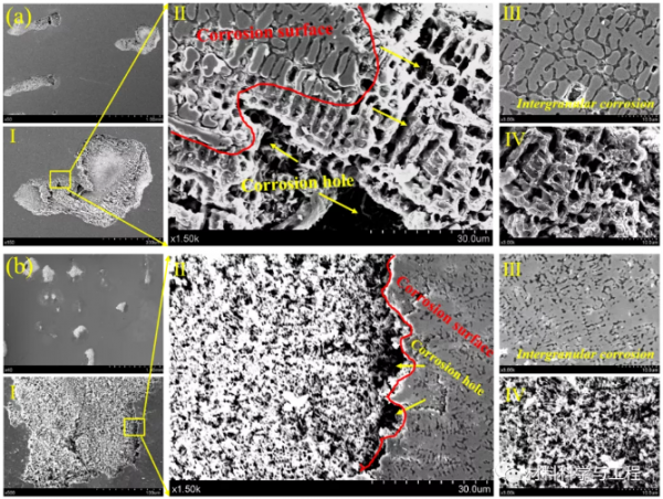 圖5 (a) CLMD和(b) EHLMD涂層電化學實驗后的表面腐蝕形貌