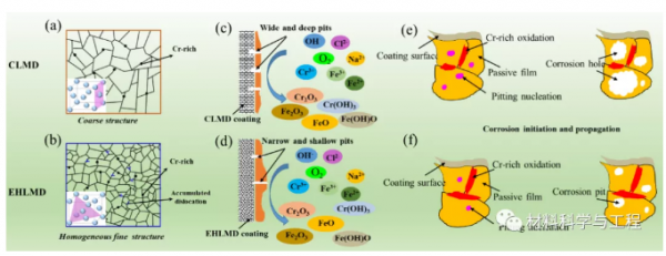 圖7(a) CLMD和(b) EHLMD涂層表面鈍化膜形成與破壞示意圖在這項工作中,研究了超高速激光沉積層和傳統激光沉積層技術制備的不銹鋼涂層的組織特征和耐腐蝕性能。超高速激光沉積涂層由于其較高的致密性、細化的晶粒和位錯滑移與層錯堆垛結構的存在,在腐蝕溶液中形成了更加致密和穩定的鈍化膜,表現出優異的耐腐蝕性能。
