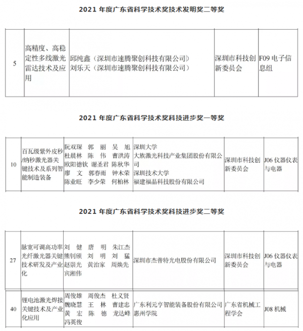 由深圳市杰普特光電完成的“脈寬可調(diào)高功率光纖激光器關(guān)鍵技術(shù)研發(fā)及產(chǎn)業(yè)化”項目,以及由廣東利元亨智能裝備有限公司與惠州學(xué)院共同完成的“鋰電池激光焊接關(guān)鍵技術(shù)及產(chǎn)業(yè)化應(yīng)用”榮獲2021年度廣東省科學(xué)技術(shù)獎科技進(jìn)步獎二等獎。