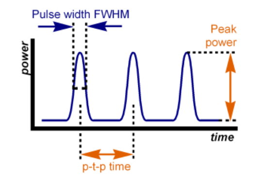 如圖2所示的激光脈沖序列中,峰值功率等于脈沖能量除以脈沖寬度,因此在同等能量條件下,縮短脈沖寬度可以大大增加峰值功率,同等脈寬條件下,提高峰值則可以增加脈沖能量。目前主流工業市場上固體脈沖激光器中,納秒級脈寬的激光器能量可達mJ級,以1mJ能量10ns脈寬計算,峰值功率可達100kW。皮秒脈沖激光器能量在300μJ左右,以10ps計算,峰值功率可達30MW。飛秒脈沖激光器能量以100μJ,脈寬500fs計算,則峰值功率達到200MW。作為比較,常規的MOPA納秒脈沖激光器的峰值功率在10kW左右,遠低于固體激光器的指標。