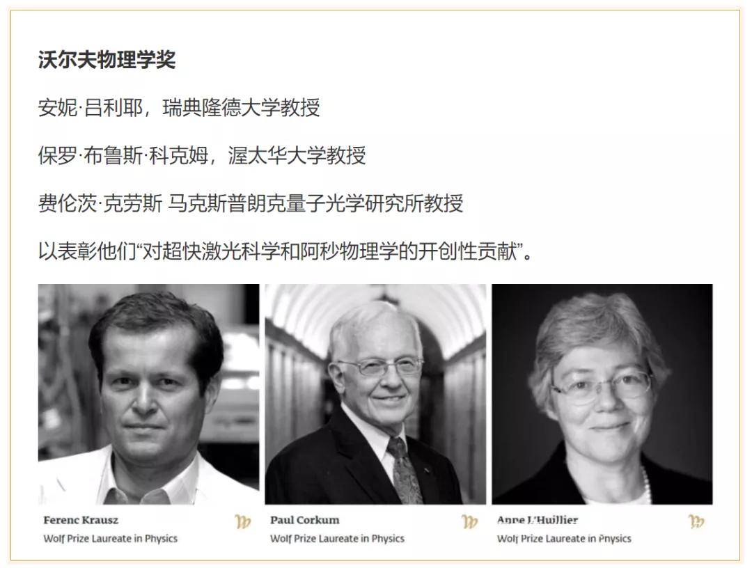 當地時間2月8日,2022年沃爾夫獎(Wolf Prize)正式揭曉,來自美國、加拿大、德國、瑞典和日本等五個國家的11位科學家摘得殊榮。其中,沃爾夫物理學獎頒發給了瑞典隆德大學教授安妮·呂利耶、渥太華大學教授保羅·布魯斯·科克姆、馬克斯普朗克量子光學研究所教授費倫茨·克勞斯,以表彰他們“對超快激光科學和阿秒物理學的開創性貢獻”。