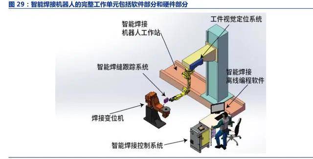 智能焊接機器人具備免示教功能,專注于鋼結構等非標工件的焊接。焊接機器人分為 示教焊接機器人和智能焊接機器人兩類。示教焊接機器人主要需要人工示教來編輯焊縫的 加工路徑,由于非標準化操作的示教過程耗時較長,因此示教焊接機器人大多應用于重復、 標準化的加工中;而智能焊接機器人通過智能焊接離線編程軟件、智能焊縫跟蹤系統、智 能焊接控制系統來生成焊縫加工路徑,可以實現免示教功能,縮短調試周期,進一步提升 智能焊接機器人的自動化程度,更適合小批量非標工件的柔性加工過程。