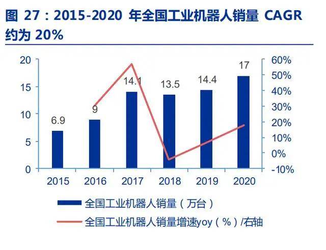 工業機器人產業地位提升,焊接機器人有望填補焊工缺口。國務院印發的《“十三五” 國家戰略性新興產業發展規劃》,進一步將工業機器人產業作為國家新型產業重點之一, 推進我國工業機器人產業快速發展。在政策加碼下,2015-2020 年,我國工業機器人市場 規模持續擴大,工業機器人產量 CAGR 約為 48%,工業機器人銷量 CAGR 約為 20%。焊 接機器人是我國最主要的工業機器人之一,操作簡單、能實現連續工作、生產效率高,而 且可以克服焊工在生產中的局限性,因此被廣泛應用于消費電子、汽車制造、工程機械、 城市建設等領域。焊接機器人產業的蓬勃發展,有望緩解工廠“招焊工難”的問題,逐步 填補部分焊工供需缺口。
