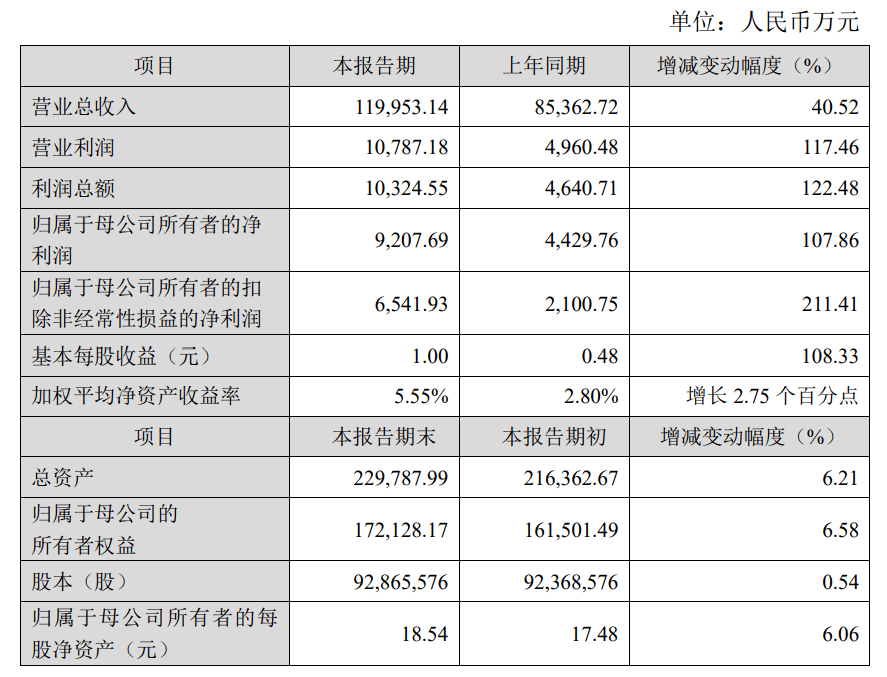 報告期內,公司實現(xiàn)營業(yè)收入 119,953.14 萬元,同比增長40.52%;實現(xiàn)利潤總額 10,324.55 萬元,同比增長 122.48%;實現(xiàn)歸屬于母公司所有者的凈利潤 9,207.69 萬元,同比增長 107.86%;報告期末,公司總資產229,787.99 萬元,較 期初增長 6.21%;歸屬于母公司的所有者權益 172,128.17 萬元,較期初增長 6.58%。