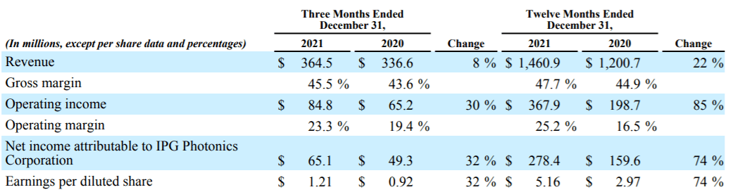 當?shù)貢r間2月17日,nLIGHT公布了2021年第四季度和全年的財務業(yè)績。2021年全年收入實現(xiàn)了2.701億美元,同比增長21.3%(2020年全年收入 2.228 億美元), GAAP全年凈利潤為1070萬美元,凈虧損2967千萬,全年毛利率為 28.6%。其中,精細微加工領域的收入增長36%,工業(yè)領域收入增長12%(非中國市場的工業(yè)市場收入增長66%,中國的工業(yè)市場收入下降33%),航空航天及國防領域的收入增長21%。