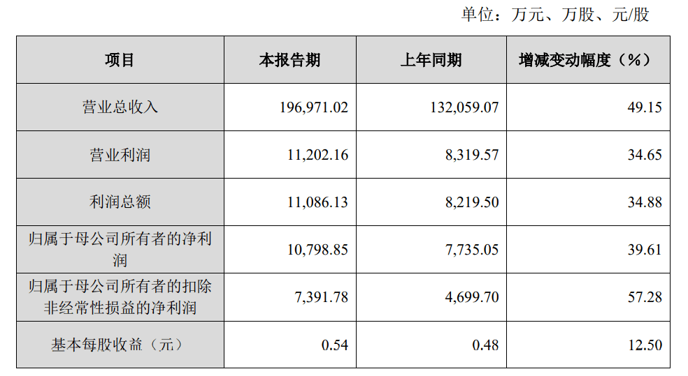 海目星發(fā)布2021年度業(yè)績快報,實現(xiàn)營業(yè)總收入19.70億元,同比增長49.15%;歸屬于母公司所有者的凈利潤1.08億元,同比增長39.61%;歸屬于母公司所有者的扣除非經(jīng)常性損益的凈利潤7391.78萬元,同比增長57.28%;基本每股收益0.54元。