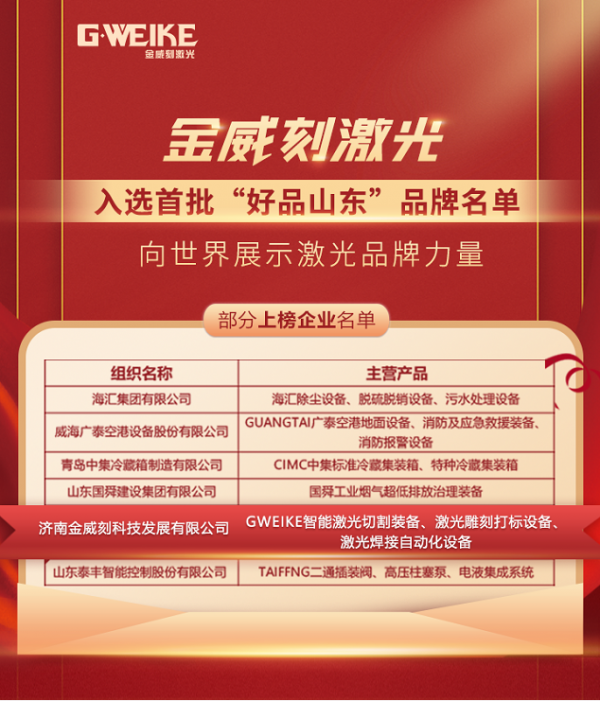 近日,山東省政府新聞辦召開新聞發布會,現場發布第一批“好品山東”品牌名單,金威刻激光作為激光智能裝備領域的優秀品牌成功入選。作為首批“好品山東”的獲得者, 金...