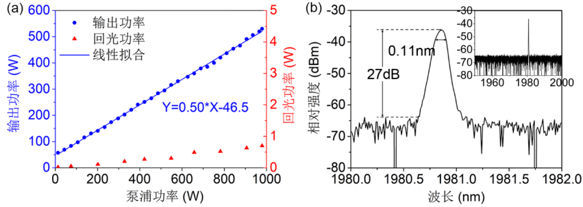 圖 4(a)放大級輸出功率及后向回光隨泵浦功率的變化;(b)輸出功率為500 W時對應的光譜