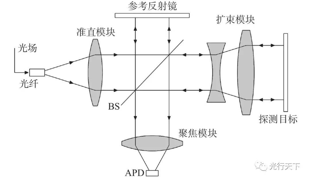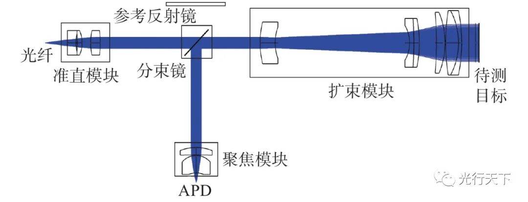 收發一體激光測距系統的工作原理如圖1所示,其中光學部分由準直模塊、分束器、擴束模塊和聚焦模塊4部分構成(圖中透鏡均為模型示意)。激光信號從光纖端口出射,首先被準直模塊整形成平行光束,然后透過分束鏡(beam splitter, BS),經擴束模塊放大光束口徑,最終照射到待測目標表面。激光束在待測表面發生漫反射后,部分回波信號重新被光學系統收集,從而被雪崩光電二極管(avanlanche photodiode,APD)接收放大。為計算激光從發射到收集的時間間隔,系統設置了參考反射鏡,可比較兩束脈沖光在收集時刻的差異,間接計算到待測目標的相對距離。