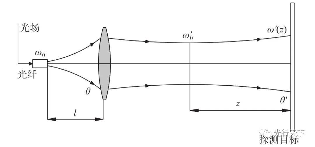 準直光學系統原理圖如圖2所示。激光束從光纖端面出射,初始束腰半徑為ω0,發散角為θ,與整形透鏡距離為l。經透鏡整形后,光束依然有著高斯光束的性質,新光束的束腰半徑為ω′0,其光斑半徑ω′(z)是傳播距離z的函數。