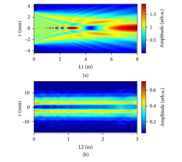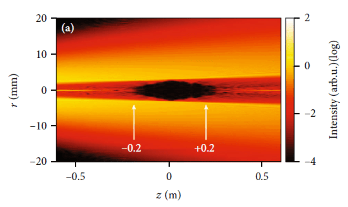 環形光束在空間中的傳播。突出顯示的區域指示應放置鏡子的位置,以有效地將阿托秒脈沖與產生的激光束分開。