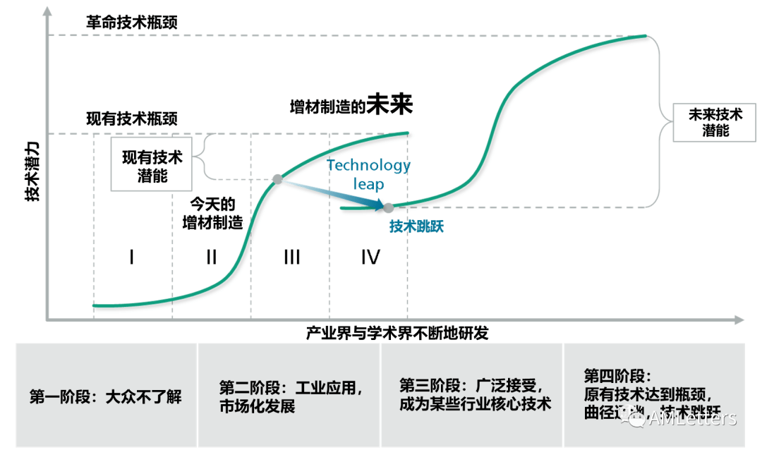 (3)引領全球增材制造技術的德國弗勞恩霍夫實驗室(Fraunhofer)的官網有這么一張圖,描述的是增材制造技術未來的發展脈絡及我們目前所處的階段。無疑,增材制造技術已經來到了簡單工業應用到廣泛接受和大規模工業應用的歷史交匯點,SLM等技術本身帶來的商業價值還會進一步爆發,但我們也要意識到,這些技術很快會達到瓶頸。光束整形(激光束整形:SLM的未來)、面曝光(區域打印 或將顛覆SLM)、綠光、藍光、混合光、飛行打印(飛行打印)等新型技術,都有可能是引發下一次技術跳躍的契機。這個行業和這個世界一樣,發展的太快了。不學習進步的企業和步伐慢的企業,終將被歷史洪流淘汰,成為一朵曾經澎湃的浪花。