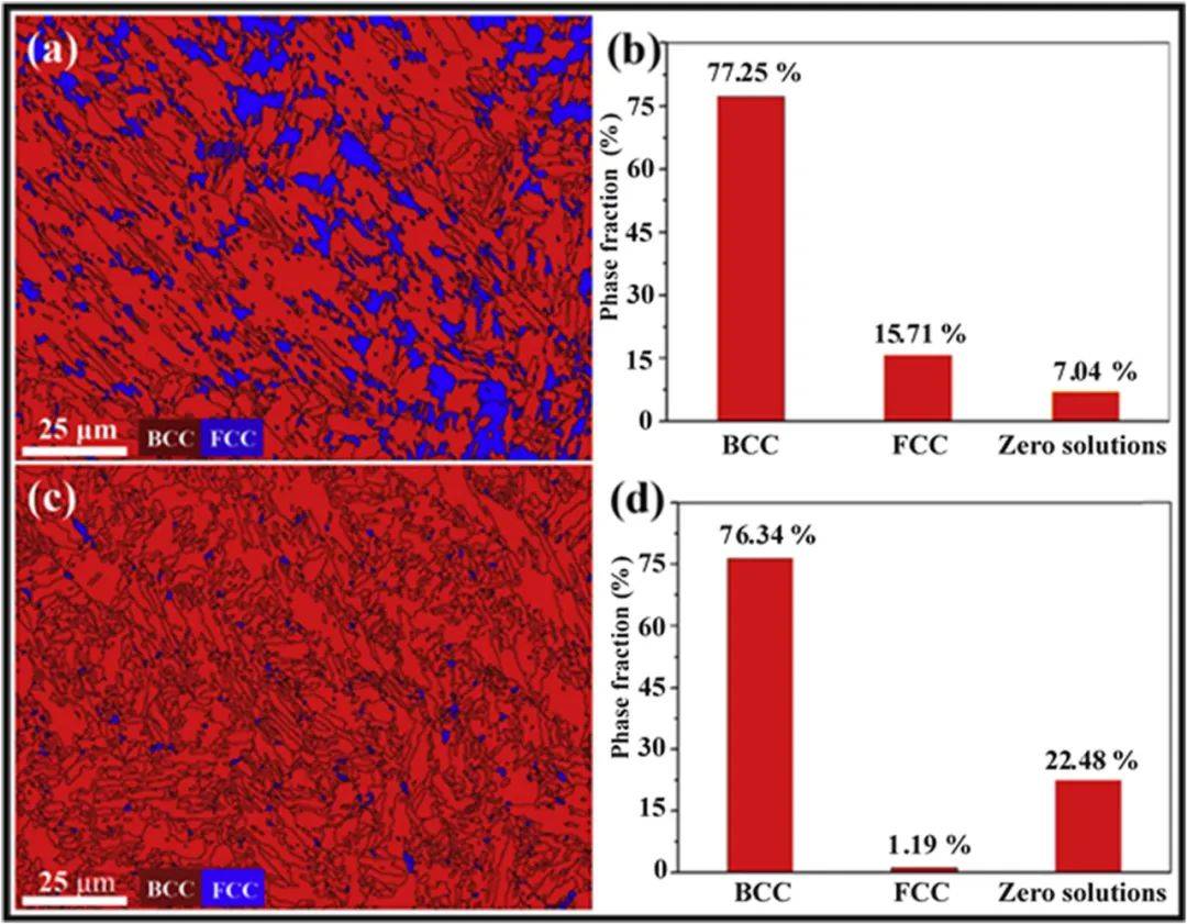 圖 22圖中包含EBSD圖,其中紅色表示BCC相位的外觀,藍色表示FCC相位分布,以及CrCoNiFeAl-xNbC(LC-HEAC)相位的條形圖,描繪了FCC和BCC相位的百分比外觀。陶瓷顆粒的加入抑制了FCC晶格結構;(a & b) x = 0 wt%;(c & d) x = 20 wt%。