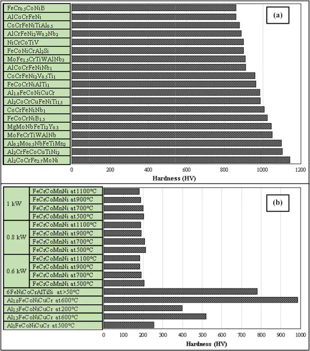 固溶體強化:固溶體對含有四種以上不同結構元素的HEAs的影響是重要的。這些HEAs合金元素導致晶格畸變,影響固溶相結構和機械性能,尤其是硬度。如上一節所示,LC-HEACs的淬火速率高,熔覆層致密,成分分布均勻,組織細化。結果表明,相同成分的lc -HEAC的硬度優于其他HEAC技術。不同研究文章的硬度數據(見圖23)顯示,LC-HEACs的顯微硬度大多是通過固溶強化而提高的。關于LC-HEACs的強化機制有很多報道,研究者研究了某些合金元素的加入對通過LC技術合成的非等摩爾HEACs的影響。