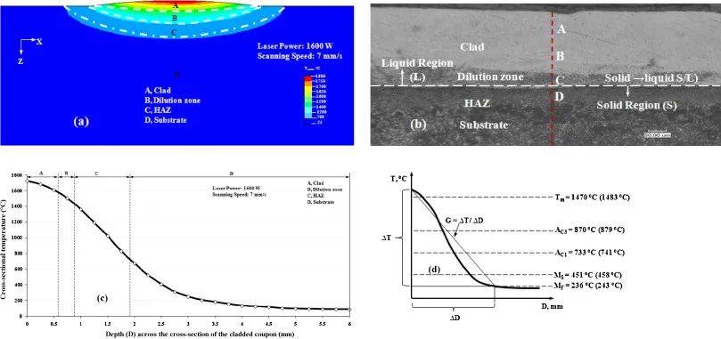 圖B (a)覆蓋片的橫斷面上的等溫線模型(b)覆蓋片的顯微圖(300×),包括覆蓋層、稀釋區、熱影響區和襯底(c)截面溫度分布,(d)溫度梯度示意圖(G)計算。
