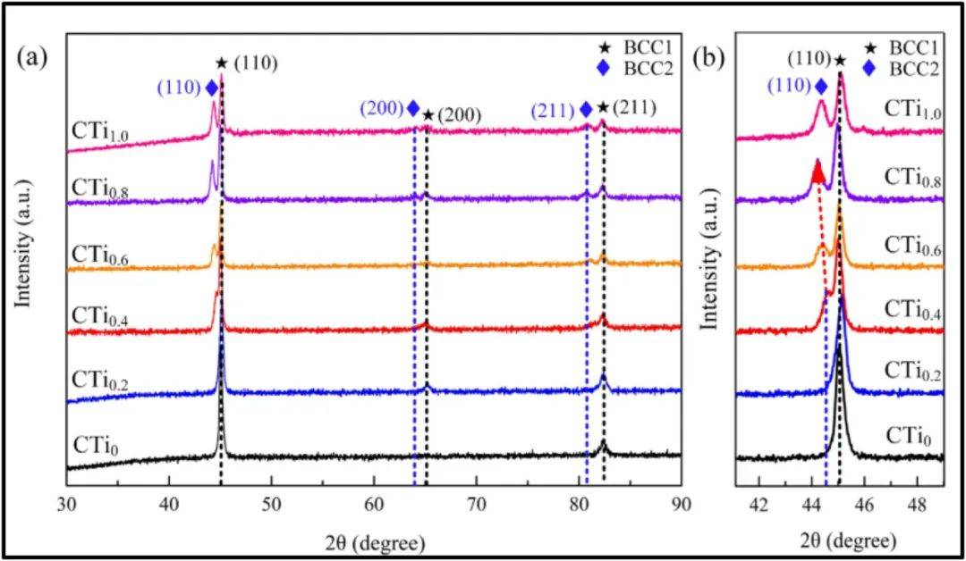 圖25 tic增強alfenicocrtix基LC-HEACs的XRD分析表明,Ti含量的加入導致了BCC2相的形成,并導致了固溶強化的形成。這種硬化模式在x=1中占主導地位。