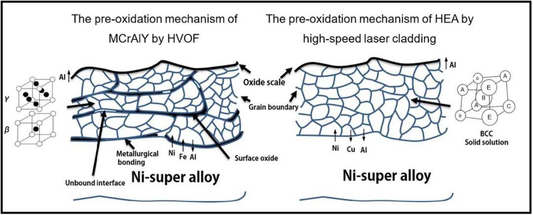 圖40 HVOF與LC-HEAC制備的傳統MAlCrY涂層預氧化機理差異示意圖晶格結構給出了材料不同的擴散系數。由于Al的持續滲透,較好的非粘結界面、表面的氧化膜以及具有較好的層狀結構的部分界面結合提供了一種阻塞效應。