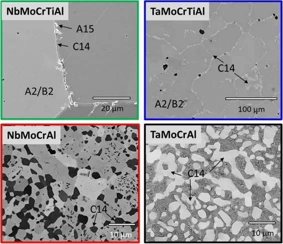 圖42 退火條件下,研究合金TaMoCrTiAl、NbMoCrTiAl、NbMoCrAl和TaMoCrAl的BSE圖像。