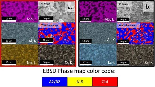 圖43 結合EDX和EBSD分析對NbMoCrAl (a.)和TaMoCrAl (b.)進行表征。